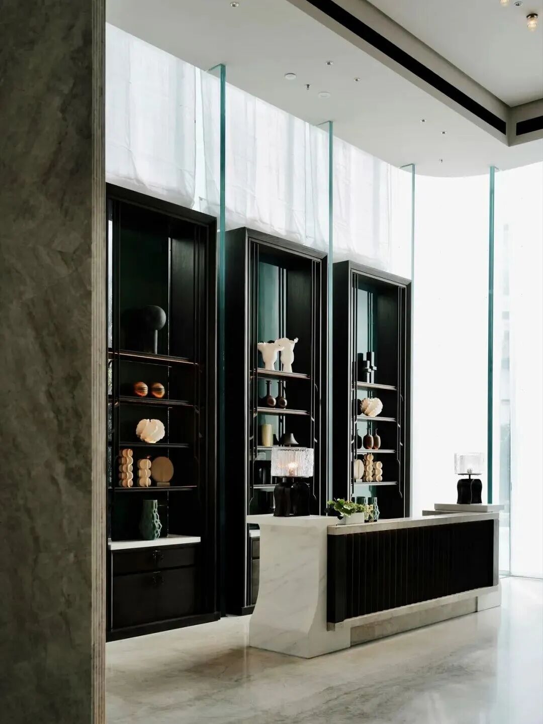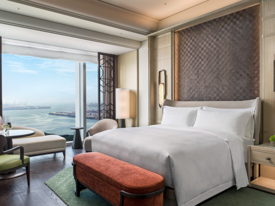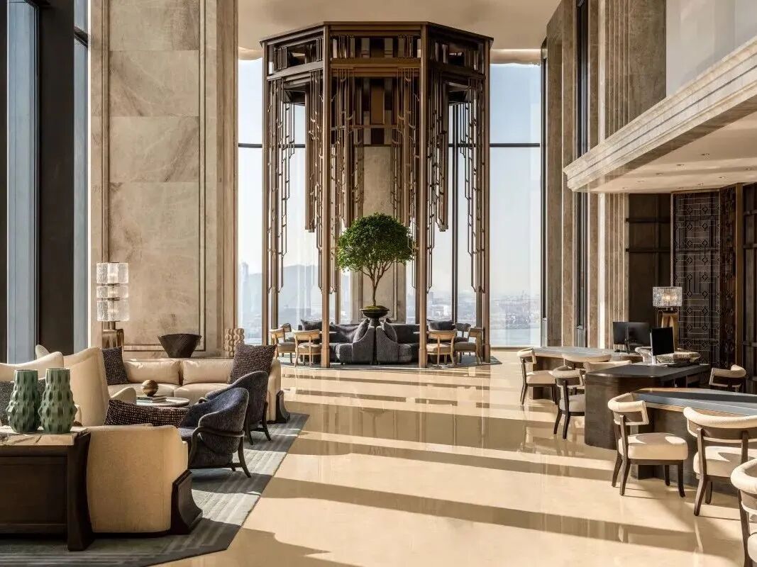 踏入酒店,仿佛进入了一个奢华的艺术殿堂。大堂位于 35 层,纯白色系搭配通透的落地玻璃窗,尽显高级感。酒店拥有 289 间雅致客房及套房,全景落地窗是客房标配,晨起可揽前海日出微光,入夜能收揽城市灯火与海湾月色。室内装饰融合东方美学,木质屏风、雪花石膏灯具及带有精细镶嵌工艺的床头板等,以匠心工艺点缀空间。