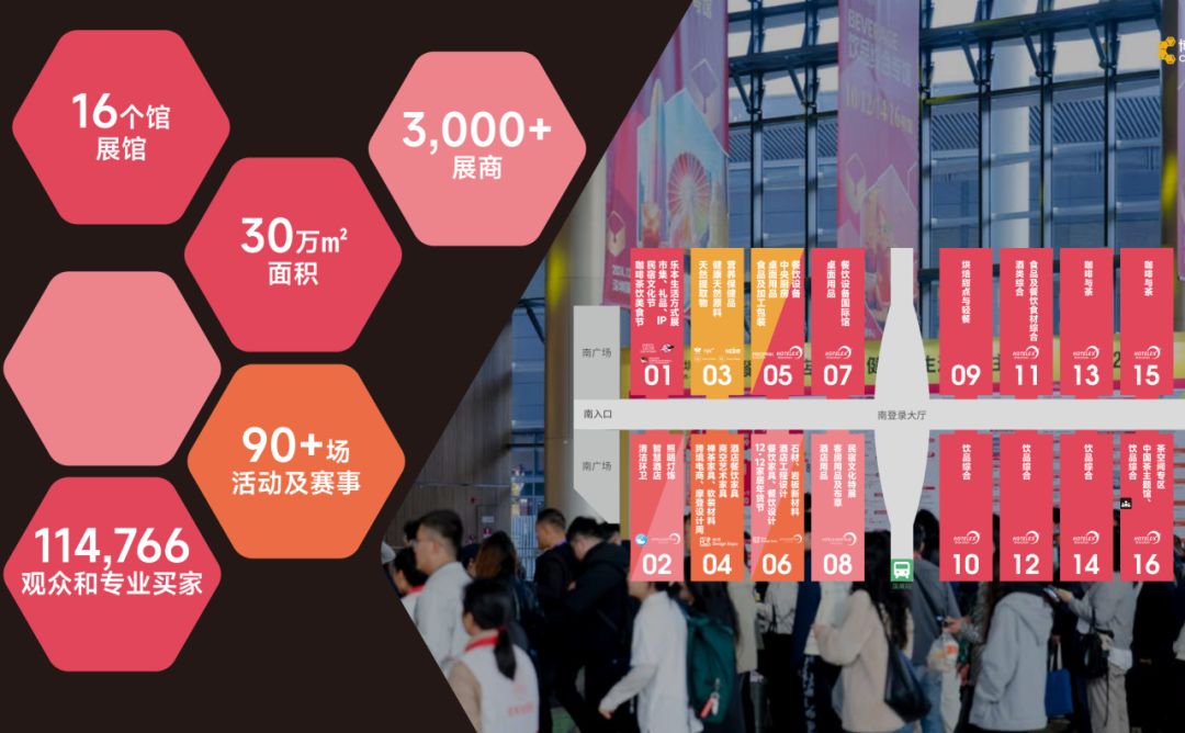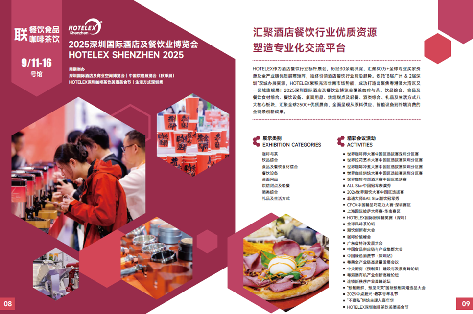 2025深圳国际酒店及餐饮业博览会覆盖咖啡与茶、饮品综合、食品及餐饮食材综合、餐饮设备、桌面用品、烘焙甜点及轻餐、酒类综合、礼品及生活方式八大核心板块,汇聚全球2500+优质展商,全面呈现从原料供应、智能设备到终端消费的全链条创新成果。