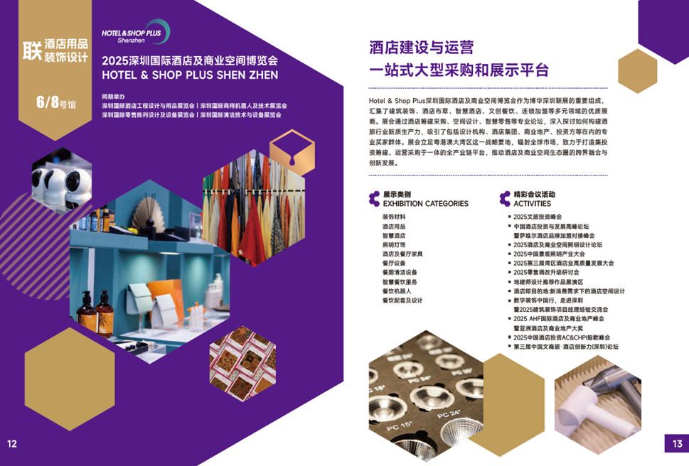 Hotel&Shop Plus深圳国际酒店及商业空间博览会,汇集建筑装饰、酒店布草、智慧酒店、文创餐饮、连锁加盟等多元领域的优质展商。展会通过酒店筹建采购、空间设计、智慧零售等专业论坛,深入探讨如何构建酒旅行业新质生产力,吸引包括设计机构、酒店集团、商业地产、投资方等在内的专业买家群体。展会立足粤港澳大湾区这一战略要地,辐射全球市场,致力于打造集投资筹建、运营采购于一体的全产业链平台,推动酒店及商业空间生态圈的跨界融合与创新发展。