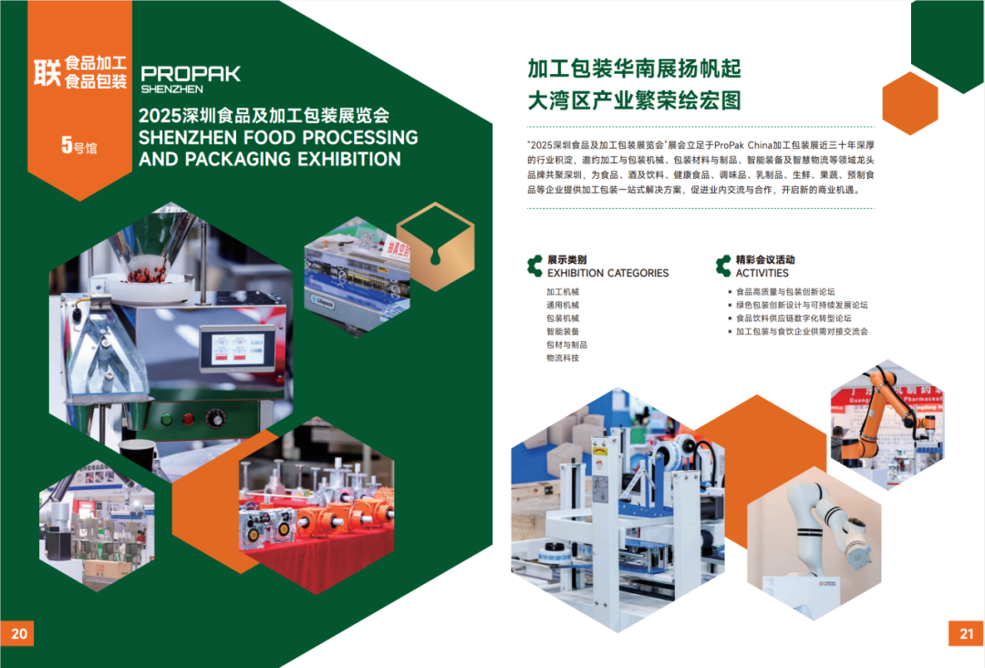 2025深圳食品及加工包装展览会立足于ProPak China加工包装展近三十年深厚的行业积淀,邀约加工与包装机械、包装材料与制品、智能装备及智慧物流等领域龙头品牌共聚深圳,为食品、酒及饮料、健康食品、调味品、乳制品、生鲜、果蔬、预制食品等企业提供加工包装一站式解决方案,促进业内交流与合作,开启新的商业机遇。